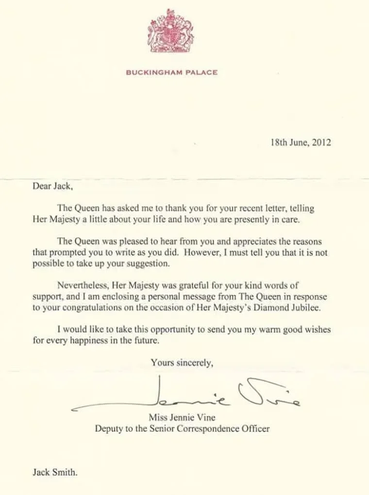 I’d completely forgotten about the letter until one day, I had a posh envelope waiting for me at my kids’ home and saw the Buckingham Palace stamp. The quality of the paper meant I instantly knew this was a letter from someone important. My heart raced as I read through the letter, but it sank just a little knowing I wouldn’t be changing my name to Prince Jack Windsor anytime soon.